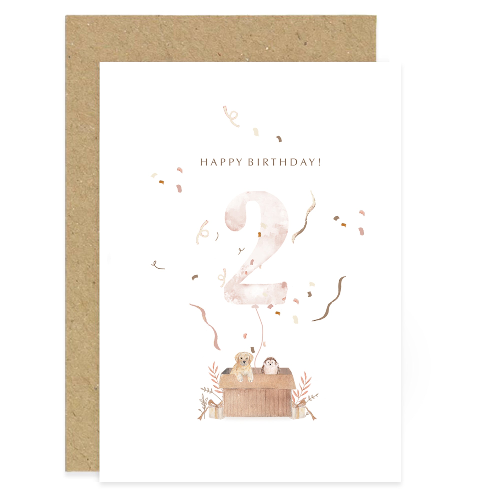 This children’s birthday card is perfect for animal lovers, featuring adorable watercolour artwork of a dog and a hedgehog, poking their heads out of a box preparing for a party with a number 2 balloon floating above with confetti surrounding it. The 2nd birthday card is blank on the inside, ready for your customers to add their own handwritten message.
