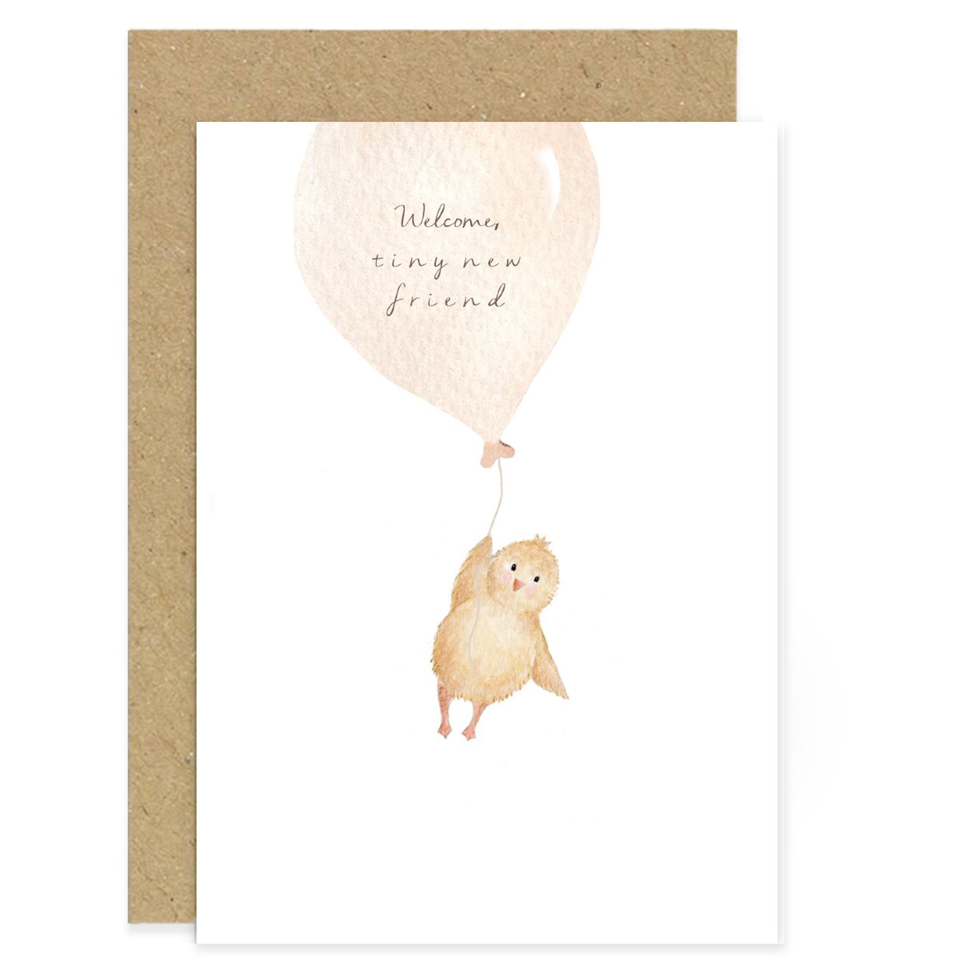 Celebrate a new wonder to the world, with this beautifully hand painted greeting card of a tiny fluffy yellow chick which has floated into the collection on a ballon with the caption ‘welcome tiny new friend’. It’s perfect to send to the happy parents and to congratulate them on the arrival of a wonderful new addition to the world and family, and is blank inside to write your own, heartfelt message.