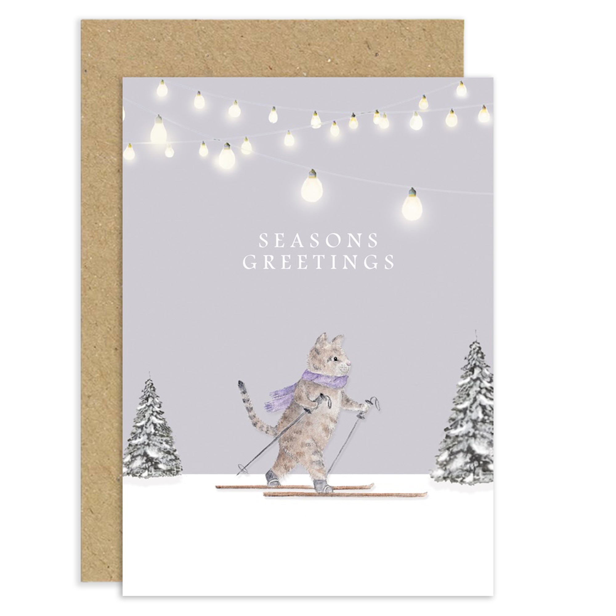 This sweet Christmas card is a great way to celebrate the holiday season, featuring watercolour artwork of a tabby cat doing cross country under some magical lights. ''Season Greetings'' is the greeting of choice on this Winter Sports card.