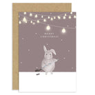 This adorable Christmas card is a wonderful way to celebrate the holiday season, featuring watercolour art of a fuzzy rabbit playing ice hockey on a snowy day, underneath some magical festive lights.