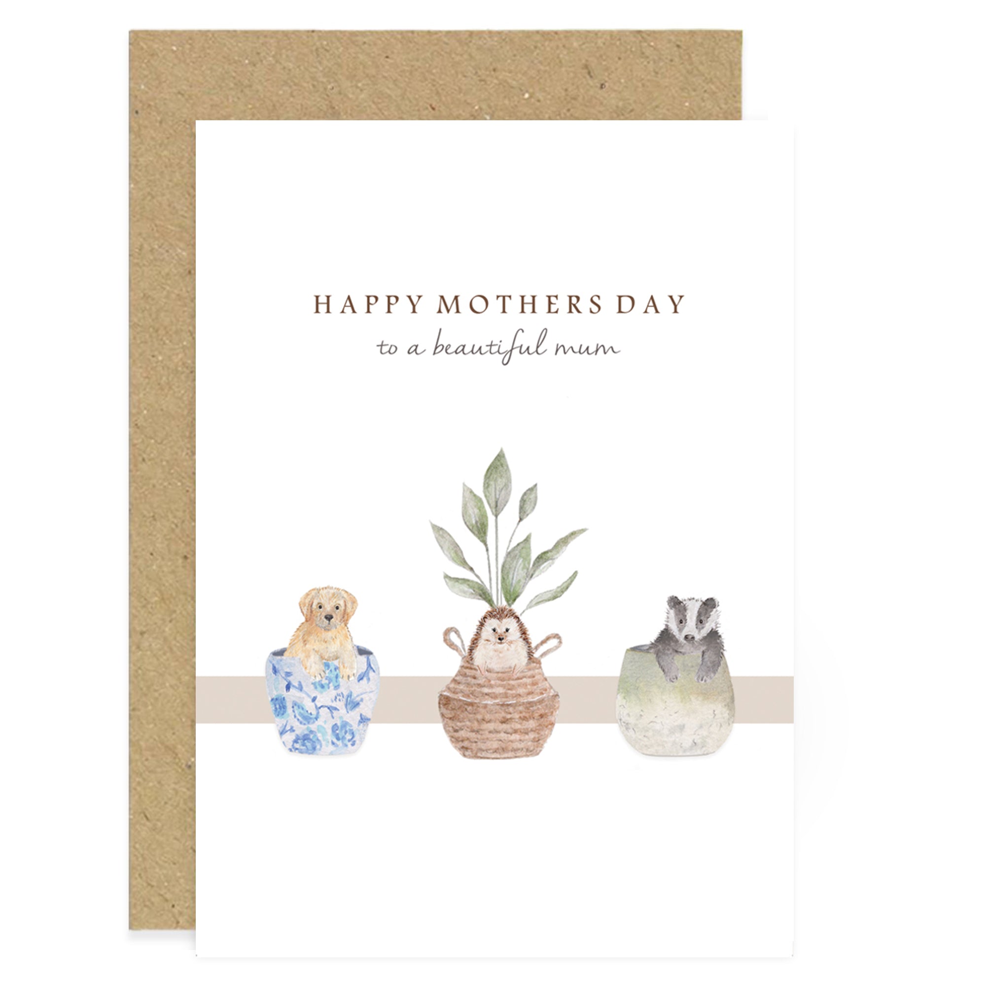 Send wonderful wishes to a beautiful mum with this adorable Mother’s Day card from UK based brand, Little Roglets. The original watercolour artwork depicts three baby animals in a variety of pottery, including a badger, puppy and hedgehog above the caption, reading “Happy Mother’s Day to a beautiful mum”.